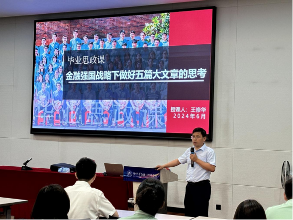 6月20日上午, 韩漫 2024届毕业生思政课在财院校区老食堂二楼报告厅举办。学院院长王修华以《金融强国战略下做好五篇大文章的思考》为题为毕业生授课,2024届全体毕业生参加。