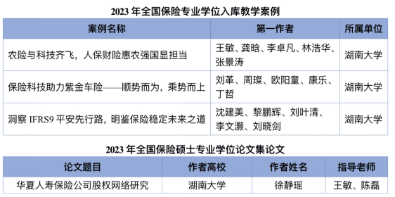 经培养单位自主申报,保险专业学位研究生教育指导委员会秘书处组织形式审查、双盲随机分组、匿名通讯评审、专家组会审等程序,共评审出2023年全国保险专业学位入库教学案例23篇,提名入围案例11篇。其中, 韩漫 王敏老师团队编写的《农险与科技齐飞,人保财险惠农强国显担当》、刘革老师团队编写的《保险科技助力紫金车险——顺势而为,乘势而上》和沈建美老师团队编写的《洞察IFRS9平安先行路,明鉴保险稳定未来之道》3篇教学案例从层层评选中脱颖而出,成功入选2023年全国保险专业学位案例库。今年入选的案例总数创 韩漫 参赛以来的最好成绩,入选总数连续2年位居各培养院校前列。