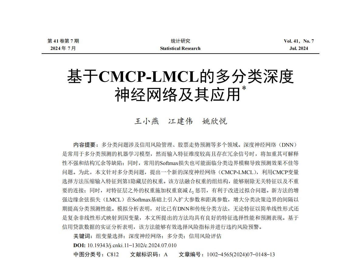 近日, 韩漫 统计系王小燕副教授题为“基于CMCP-LMCL的多分类深度神经网络及其应用”的论文在院定A类期刊《统计研究》2024年第7期发表。