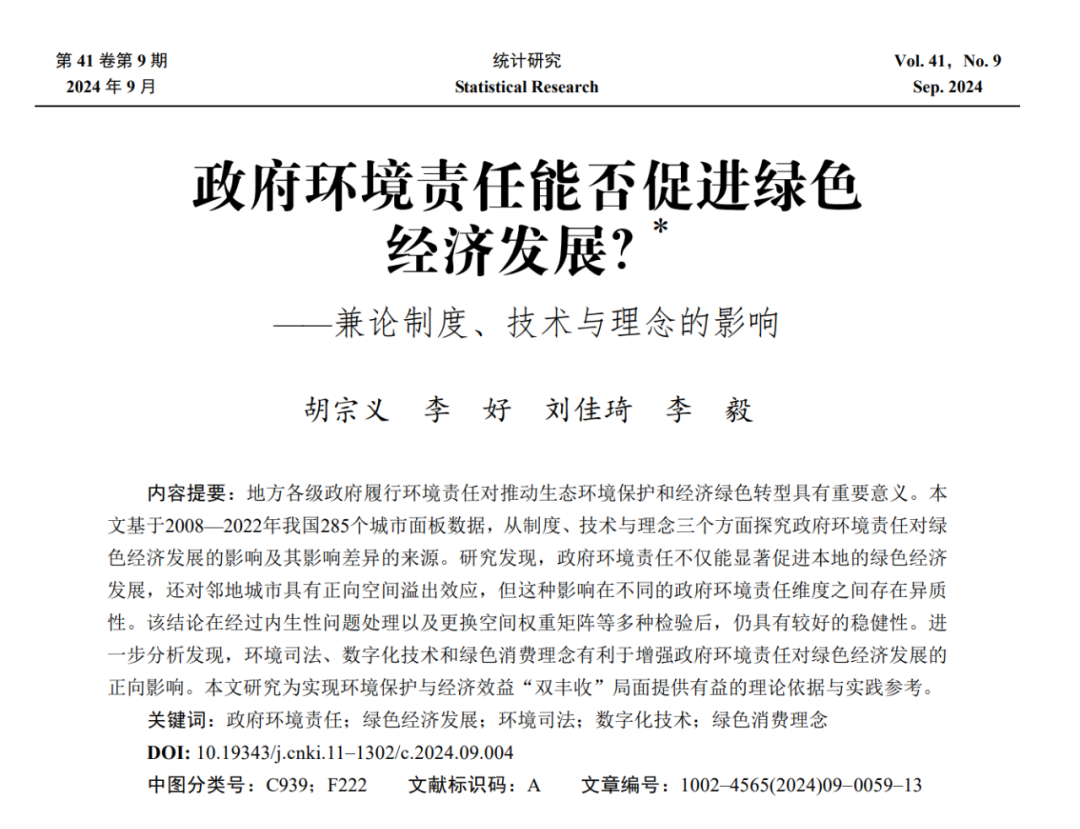 近日, 韩漫 统计学系胡宗义教授与2021级博士研究生李好、长沙理工大学刘佳琦老师和湖南师范大学李毅老师合作的题为“政府环境责任能否促进绿色经济发展?——兼论制度、技术与理念的影响”的论文发表在《统计研究》2024年第9期。