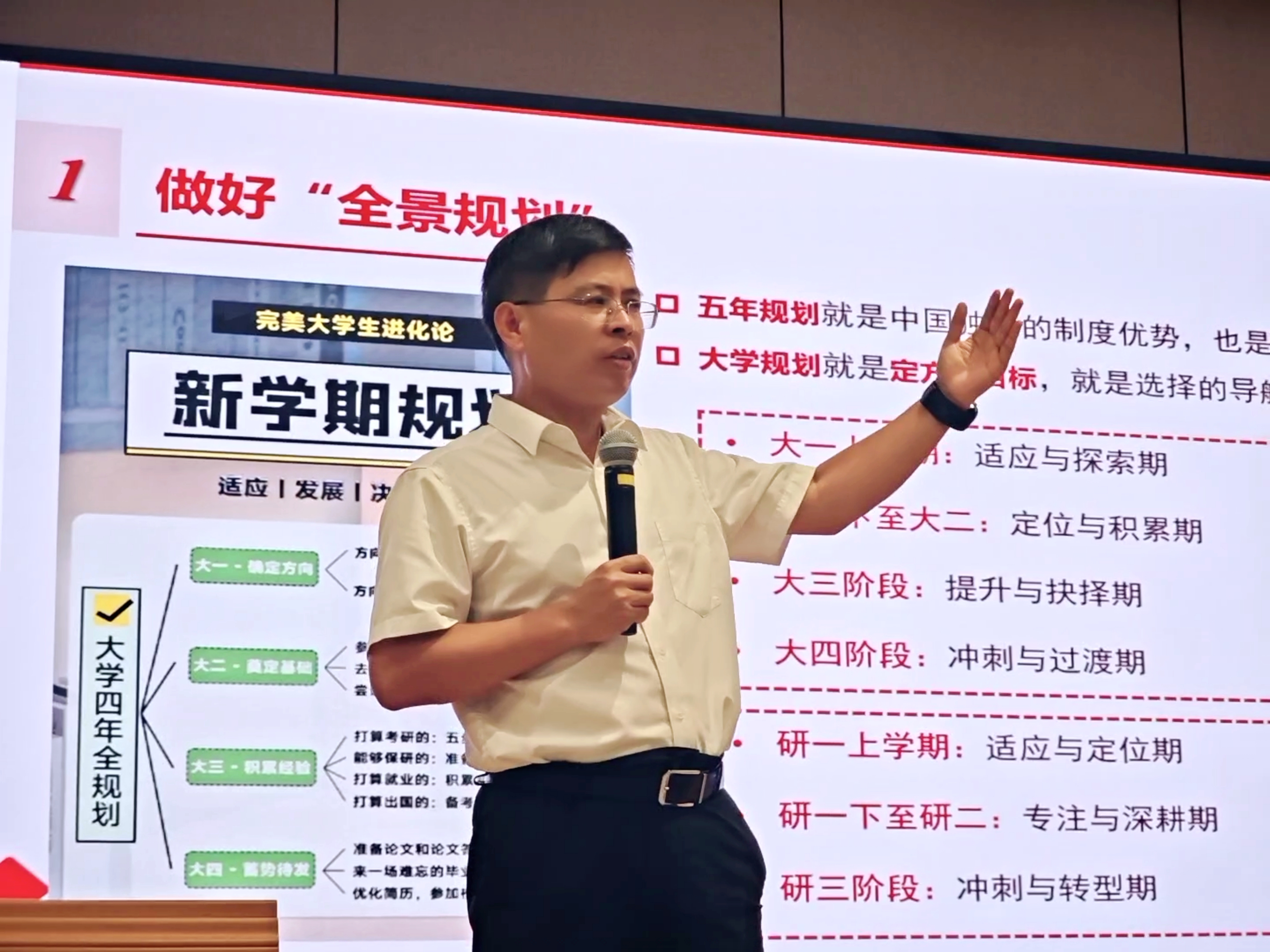 王修华首先对全体新同学加入金统大家庭表示热烈欢迎,并结合自身的的成长历程,用心用情向同学们讲述大学成长。他围绕“读懂中国”“读懂学院”“读懂自己”三大核心维度,为新生们勾勒时代坐标、解读学院底蕴、指引成长方向。一是读懂时代之中国,在责任担当中定位青春坐标。王修华聚焦“时代坐标之变、战略导向之变、核心使命之变、科技驱动之变、文化自信之变”,分析新发展阶段与百年未有之大变局的国内外形势,解读教育强国建设、金融强国建设的新要求,指出“人工智能+”带来的新挑战,同时强调文化自信的重要性。二是读懂奋进之学院,在深厚底蕴中汲取成长力量。他从学院发展历程、学科专业、人才培养体系、师资队伍、科学研究、服务国家战略、学术氛围、学生创业创新等方面系统梳理学院的历史积淀与人才培养成果,强调学院始终与时代同频共振。学院开展的“金”夕毕业晚会、“五羽轮比”师生羽毛球赛、“点金”学业帮扶计划、“夺金合伙人”双创双选会等活动,为学生提供了学术、体育、实践全方位成长平台。三是读懂未来之自己,在知行合一中书写无悔华章。王修华建议按“适应-发展-决策-提升”四阶段做好全景规划,并以“立志、奋斗、坚持、求索、创新、格局、行动、平衡”八大关键词指导大家践行规划。他引用朱熹“为学须先立志”与张载“为天地立心”的名言,鼓励新生立大志;以《平凡的世界》孙家兄妹、钱学森归国等案例,诠释奋斗的意义;用“每天进步1%一年后将脱胎换骨”的复利效应、阿米尔汗为角色减重增肥的坚持,强调持之以恒的价值;结合爱因斯坦“提出问题比解决问题更重要”,倡导新生保持求索精神与创新思维;以“格局决定全局”提醒新生学会欣赏他人、承担责任;最后,他结合施一公、钟南山的案例,建议新生做“行动派”,平衡好学习与生活,以强健体魄支撑理想追求。