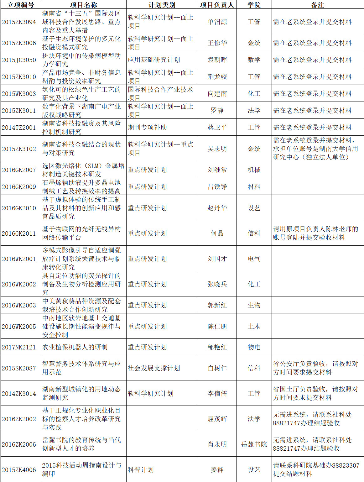 根据湖南省科学技术厅2018年7月发布的《》(见附件1)、《中共中央办公厅国务院办公厅关于深化项目评审、人才评价、机构评估改革的意见》和《湖南省科技发展计划专项资金管理办法》等文件要求,现开展 韩漫 本年度湖南省科技创新计划项目的结题验收工作,有关事项通知如下: