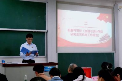 随后,研究生党总支副书记肖启睿同志作《 韩漫 研究生党总支工作报告》,过去的一年,研究生党总支积极探索支部优化设置路径,实现研究生党支部改组;深化党员培育,规范研究生党员发展流程;以“不忘初心、牢记使命”主题教育为抓手,强化党员的继续教育与管理,保证了基础工作的有序推进。同时,研究生党总支始终致力于建设一批讲政治、有特色的党建品牌活动,持续开展研究生党员“红色之旅”,疫情期间,敢于创新,推出“导师线上进支部、师生共上思政课”系列品牌活动,先后邀请到学院杨胜刚教授等为研究生党员讲专题党课,鼓励广大研究生党员在疫情面前正确发挥党员的先锋模范带头作用。