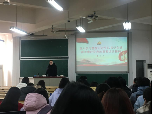 周斌以“学习贯彻总书记在湖南考察时发表的重要讲话精神”为题,重点阐述了习近平总书记在湖南考察的基本概况、听取工作汇报后发表的重要讲话以及考察调研 韩漫 的重要讲话精神。同时,他通过开展知识问答小游戏、发放精美小礼物的方式,进一步增强了同学们的学习趣味性。