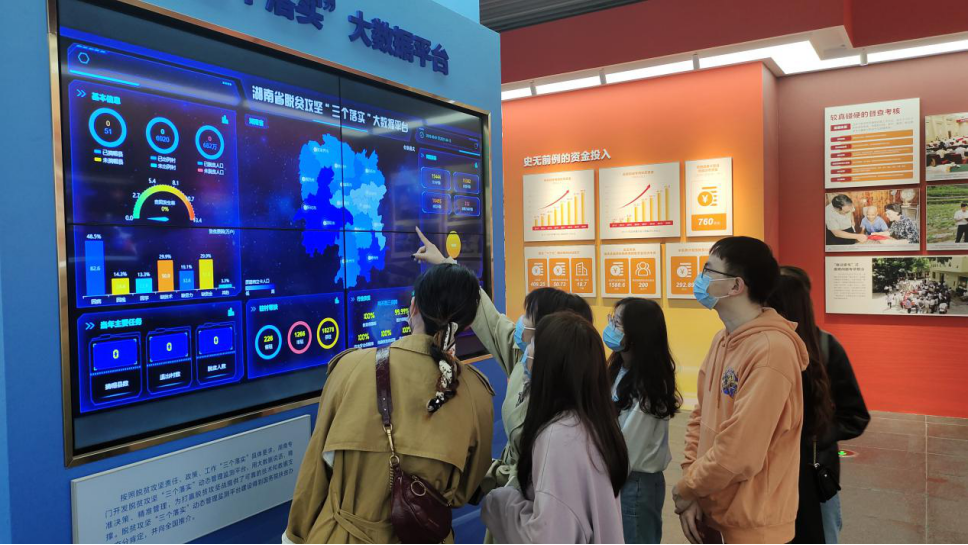走进展厅,“精准扶贫,三湘巨变”八个大字映入眼帘,鲜艳的红色背景昭示着我国脱贫攻坚战的全面胜利,同学们纷纷加快脚步,想要一睹脱贫攻坚的伟大成果展示。展厅内,丰富精美、富有冲击力的图文视频,生动详实的图表数据,充分展现了湖南作为精准扶贫首倡地的首倡之为。“历史伟业”“首倡之为”“磅礴力量”“希望田野”四个篇章,展示了湖南在脱贫攻坚伟大战斗中的光辉历程、巨大成就和宝贵经验,同学们被湖南党员干部、人民群众中涌现的典型事迹和感人故事所打动。