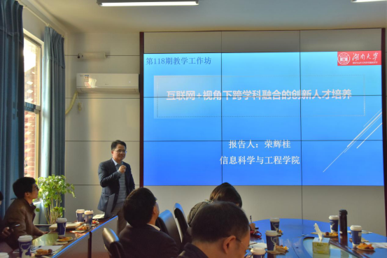 随后,信息科学与工程学院荣辉桂副教授介绍了“互联网+视角下跨学科融合的创新人才培养”问题。荣教授认为,当前的互联网与传统行业的融合,极大地改变了人们的生活方式,也为跨学科融合的创新人才培养带来了新的机遇。同时,在互联网+环境下跨学科融合人才呈现以下特点:熟悉互联网模式、掌握专业IT知识、精通领域知识和财务知识等。他还认为创新人才培养的三大痛点是对资源需求高、培养周期长、产出效率低、培养模式实施难等,并提出了相应的解决方案:构建跨学科融合的创新人才最“小”教学体系,有效地平衡现有教学资源不足和创新人才培养的矛盾;实施“做中教,做中学”跨学科融合的创新人才实践策略,有效地解决创新人才培养的“落地难”问题;构建“做中学,学中创”模式,以高水平创新创业大赛驱动多学科融合创新人才培养过程,有效地缓解创新人才培养周期长,效率低的问题。