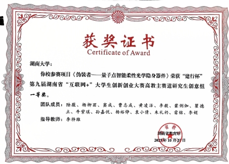 为了进一步将所学知识与时代发展相结合,瞿德立同学也积极参加创新创业竞赛,在国防军工和乡村振兴领域做出了自己的尝试。一开始,作为金融专业的同学,他因为自己不具备理工科背景看不懂项目而备感焦虑。而后来,随着不断的学习和交流,他对于项目技术和所处行业情况有了更加深入的了解,并形成了自己的认知。作为项目商业化的主导者,他和材料院以及工管院的同学通力协作,完成了商业模式的搭建,团队成果得到了大赛评委的认可,获得湖南省“互联网+“创新创业大赛金奖。