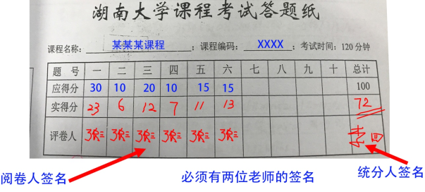 第七条 流水阅卷的试卷,各题阅卷教师须在答题纸第一页的记分栏中签名(全名),合分教师在最后统分栏签名(全名)。